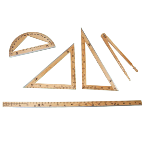 ESCUADRA DE MADERA 45", 60", REGLA 1 MTO., TRANSPORTADOR Y COMPAS