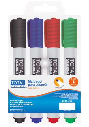 MARCADOR PARA PIZARRON ESTUCHE C/4 TOTAL OFFICE TOMPP-04