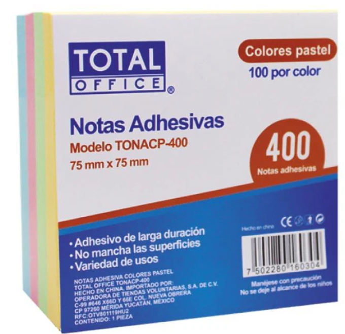 NOTAS ADHESIVAS TOTAL OFFICE 3X3 CUBO PASTEL C/400 HJS